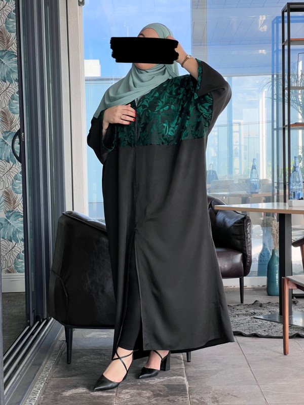 Sublimez votre style avec cette abaya noire raffinée, rehaussée de magnifiques détails verts émeraude sur l’épaule. Conçue dans un tissu fluide et confortable, elle est idéale pour les grandes occasions ou un look chic au quotidien. Associez-la à vos accessoires préférés pour une allure unique.